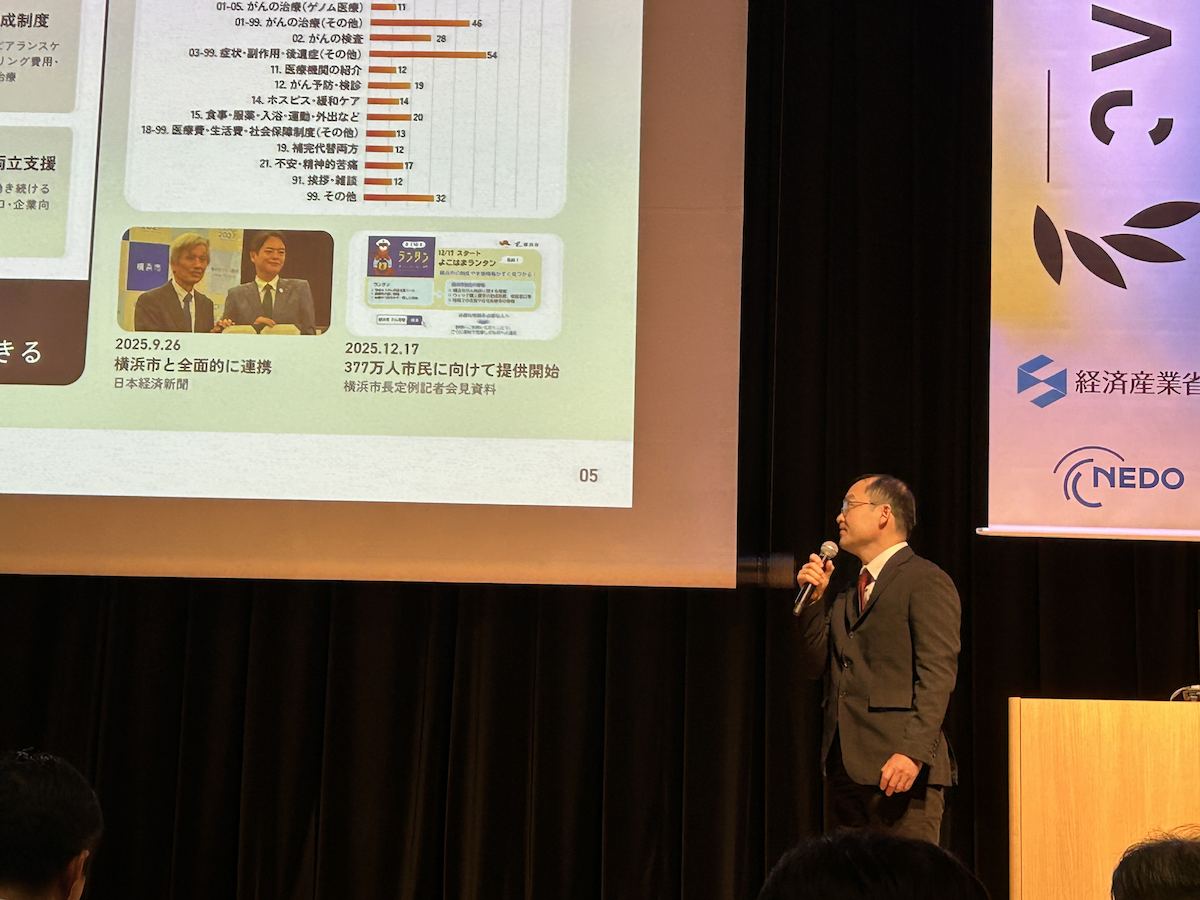 ランタンは、がんを抱える方が治療・ケアの選択肢を見つけ、地域の専門家につながれるよう設計されたAIサービスです。横浜市377万市民を対象とした地域版「よこはまランタン」の実証も進んでおり、自治体DXのモデルとして展開しています。信頼性の面では薬剤師による検証を通じて薬品名の誤情報(ハルシネーション)を低減する取り組みも行ってきました。